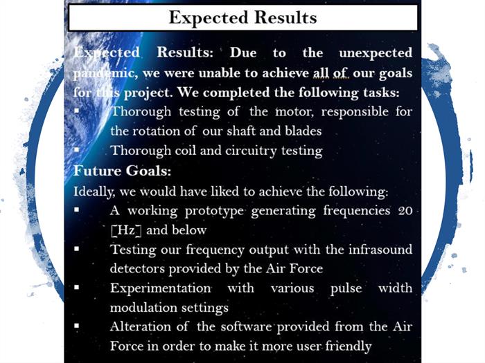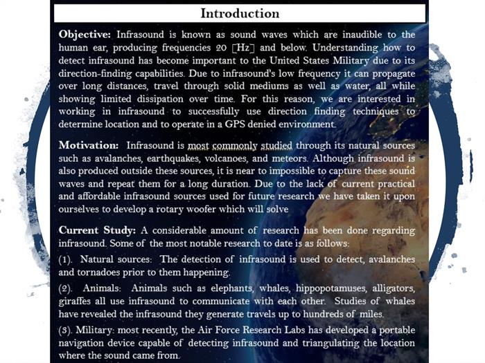 Infrasound is below the lower limit of audibility which is classified as frequencies below 20Hz. Natural sources of infrasound are things like avalanches, earthquakes, volcanoes, and meteors. Some unnatural sources of infrasound booms are things like rocket or missile launches. Understanding how to detect infrasound has become important to the United States Military. Infrasound is useful because of its low frequency it can travel long distances and get around obstacles with little dissipation. For this reason, we are interested in working in infrasound to successfully use direction finding techniques to determine location and to operate in a GPS denied environment. Possible users could be military and search and rescue teams operating in tactical field environments. The Military is our targeted stakeholder due to their interest in using infrasound detection technologies to detect where and when a missile launch occurs to help with national security. There have been studies about the use of infrasound to achieve direction finding by positioning sensors to isolate where the infrasound is emitting. These studies have been inconclusive when it comes to testing because detecting infrasound is difficult without a known and continuous source. In order to solve these issues, it’s necessary to build a common source of infrasound so that the direction-finding systems could successfully isolate an exact infrasound emitter. One way to produce low infrasound is to combine a subwoofer with a fan to include speaker voice coils to alter the pitch of the fan blades to achieve a much lower frequency using less power. This combination of materials is known as a Rotary Woofer. A Rotary Subwoofer is a type of subwoofer that produces very low frequency waves (infrasound) by using a voice coil’s motion to change the pitch of fan blades to generate certain waves. One of the main advantages of a rotary subwoofer is that the amplifier takes much less power to operate than a traditional subwoofer since it is only changing the pitch of the blades. Our project consists of 3D printed parts, magnets, sound coils, shafts and a motor to demonstrate the possibility and affordability of building an infrasound emitter, something that has not been perfected at a low cost. Ideally, we would want to test out emitter using infrasound sensors created by the Air Force research labs and alter the sensor’s code in order to read our emitters infrasound generation.
