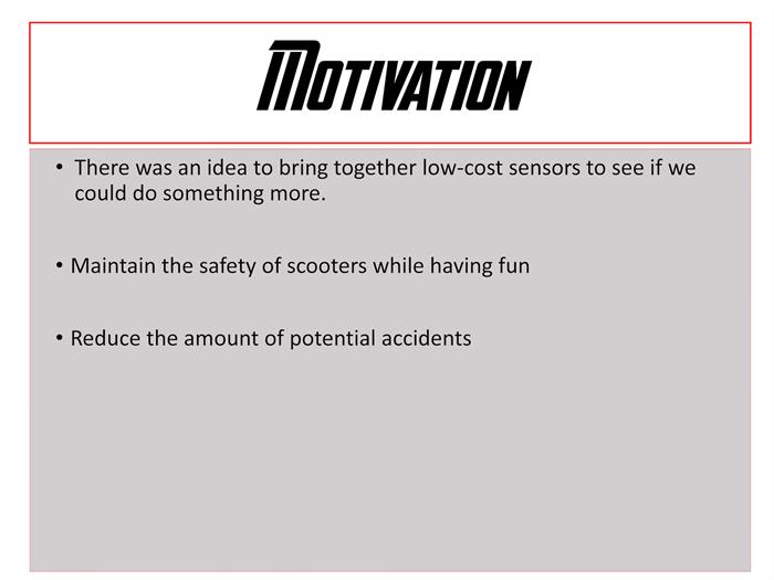 As the world grows and cities become more crowded, we develop new ways of transportation. In the last few years, we have seen an increase of electric scooters around downtown Denver and its surrounding areas, which makes transportation much faster during any time of day. Unfortunately, the companies who manage the scooter rentals do not have many safety measurements in place that insure a safe ride. This is where we as students at the University of Colorado at Denver and future engineers come in. We have developed a safety system that will prevent riders from crashing into anything in front of them as well as always knowing if something is behind them. Our motivation behind this project comes from the unfortunate event that took Cameron Hagan’s life after a collision with a car.